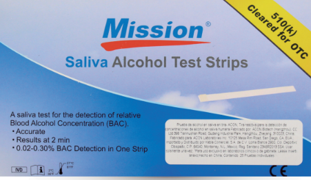 La Prueba de detección de alcohol en saliva Mission permite realizar exámenes evidenciales para detectar la presencia de alcohol. La tira de alcohol Mission consiste en una tira de plástico con una almohadilla reactiva en la punta de la misma, la almohadilla reactiva emplea un sistema químico de fase sólida que efectúa una reacción enzimática de alta especificidad, además de ser económica, confiable, y fácil de utilizar, por lo que es una excelente opción para realizar exámenes de alcohol ya sea por sospecha, después de un accidente, o de manera aleatoria en su empresa o institución.
